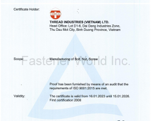 >Business Philosophy:Sincerity, Dependability, Innovation>Business Principles:Continuous operation, pursue excellenceTo encourage the entire fellow workers in accordance with the sincere spirit to manufacture products which meet customers` demand and quality. Simultaneously, to provide customers with the fair price, rapid lead-time and kindness service. On the other hand, to unify the company`s resources to reach the enterprise`s goal and allow them making profits continuously which present the profit to customers, employees, shareholders, suppliers and relevant benefit parties. Lastly, in accordance with the consistent logics and dependable spirit to continue improving and seeking excellence in the future to make the enterprise operating permanently.Thread Is Challenging Limit.