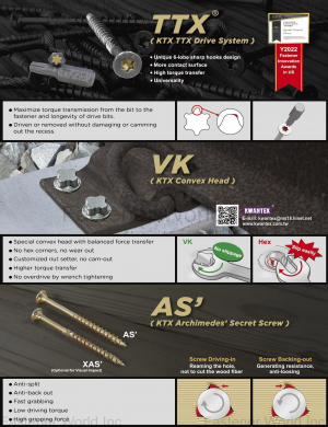 ,省時又不費力,就算是新手也能輕鬆完成作業。寬仕TTX® Drive System除了可以適用於木螺絲外,也能使用在貫穿建築股份有限公司2020年產品研發領域再現大突破,成功開發出具六瓣勾狀態樣的TTX® Drive System(Taiwan...