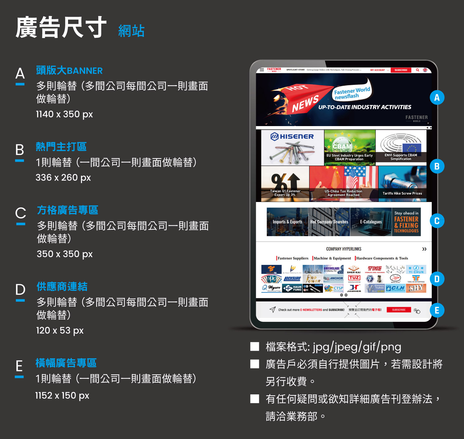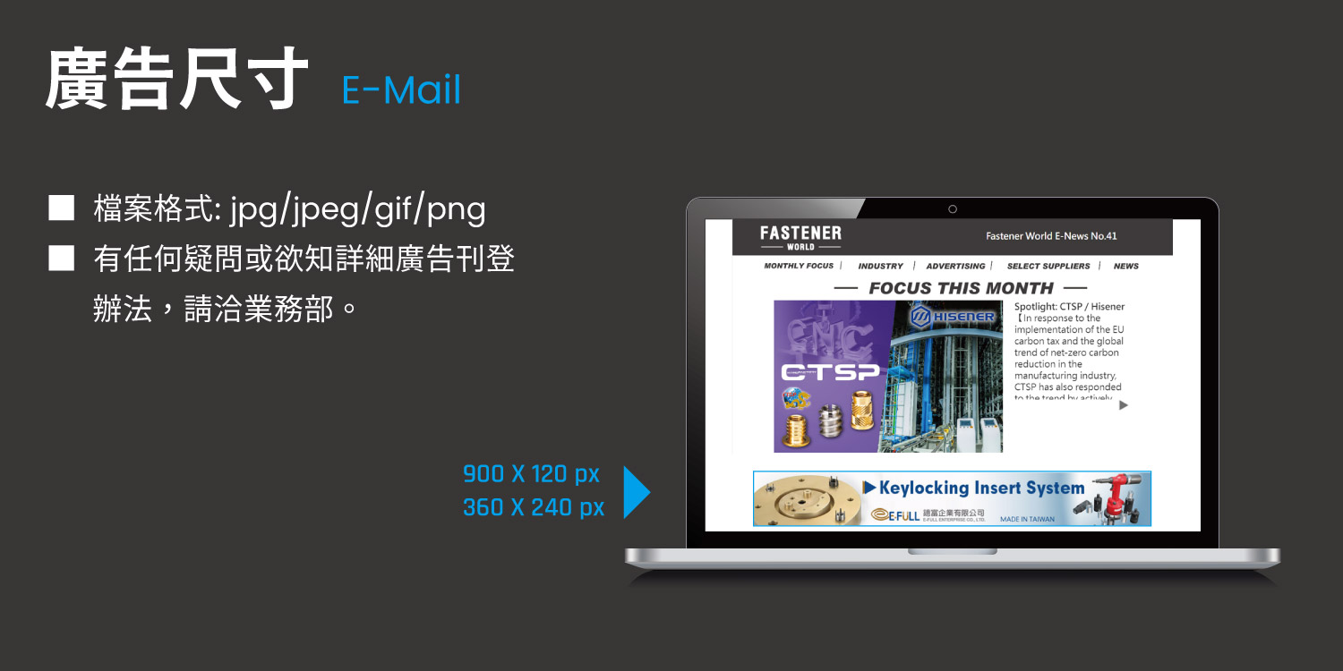 除了紙本雜誌外,我們也逐漸擴及到更多數位化的服務。已累積超過600萬人次瀏覽量的官方網站提供便利的「B2B買與賣採購平台」,方便扣件、五金、緊固工具和零組件相關買家賣家相互交流; VIP會員也能解鎖產品貼文等更多加值服務,爭取更多買主關注; 此外,每月定期EMAIL電子報給全球近30萬客戶,和線上電子書提供讀者即時閱覽和下載,協助其了解最新產業趨勢;