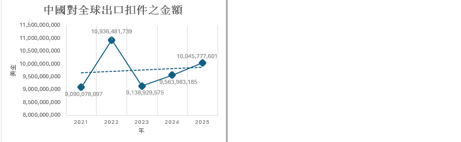 - 2024年,東協自全球進口扣件之總合為3,927,396,093美金,同年東協自中國進口1,448,670,416美金,中國市占率為36.8%。若將中國在2025年對東協的出口額(1,775,744,391美金),與2024年東協自全球進口扣件之總額相比,則市占率為45.2%。