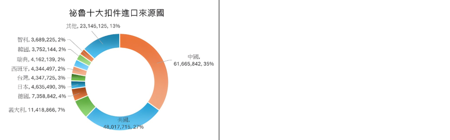 - 2024年,前 15 大拉美國家自全球進口扣件之總合為4,863,204,949美金(參閱惠達雜誌第214期),同年墨西哥、巴西、阿根廷、智利、祕魯這前5大拉美國家拉美自中國進口868,918,325美金,粗估中國市占率約17.8%。