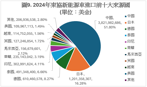 圖8(來源:ASEANstats)顯示東協進口中國新能源車的金額在2020與2024年之間連續五年都成長,在2024年達到38.21億美金,總成長幅度達到更驚人的467.1%,顯見東協對中國新能源車的猛爆需求。