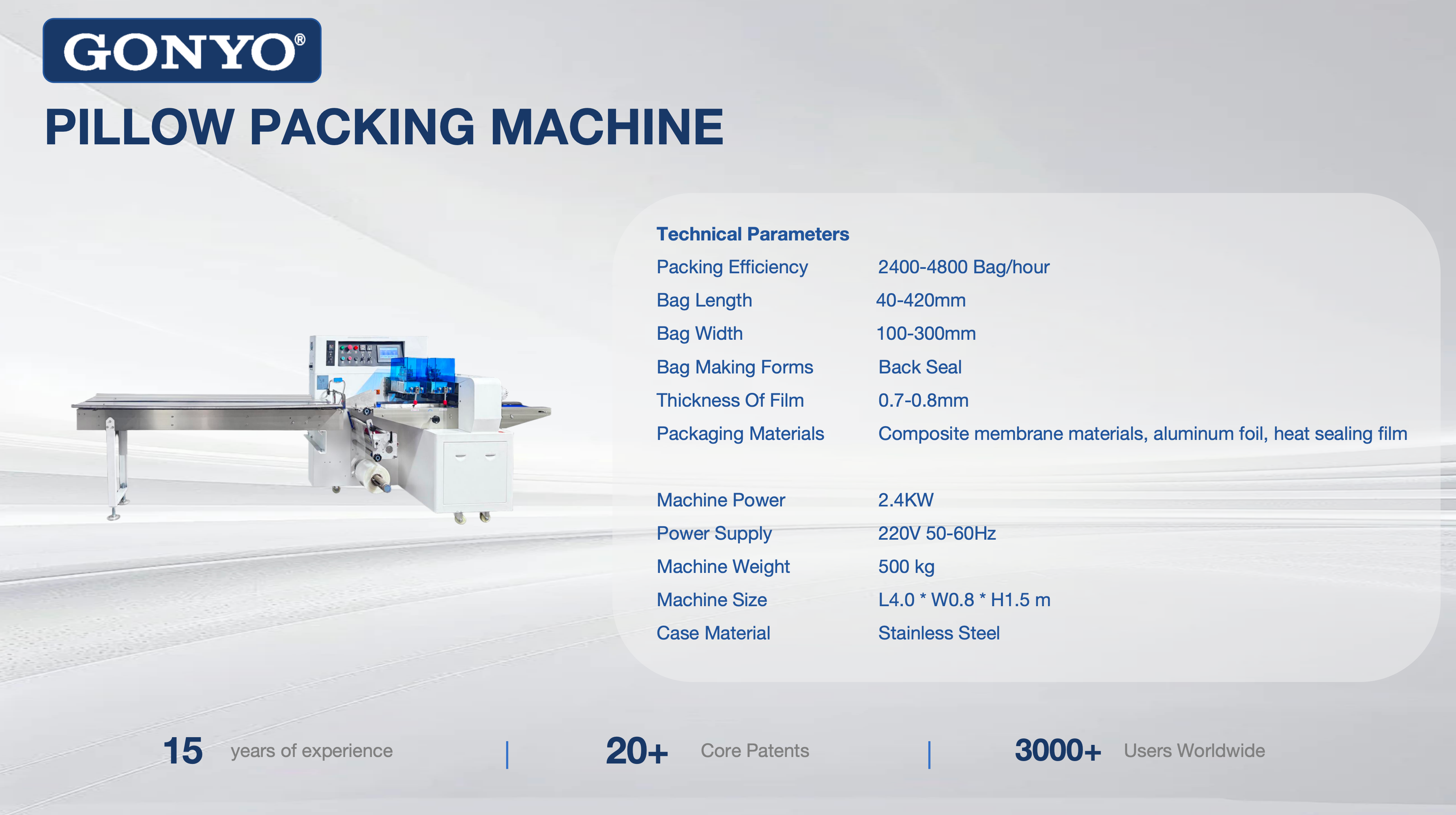 Technical Parameters Packing Efficiency 2400-4800 Bag/hour Bag Length 40-420mm Bag Width 100-300mm Bag Making Forms Back Seal Thickness Of Film 0.7-0.8mm Packaging Materials Composite membrane materials, aluminum foil, heat sealing film Machine Power 2.4KW Power Supply 220V 50-60Hz Machine Weight 500 kg Machine Size L4.0 * W0.8 * H1.5 m Case Material Stainless Steel |