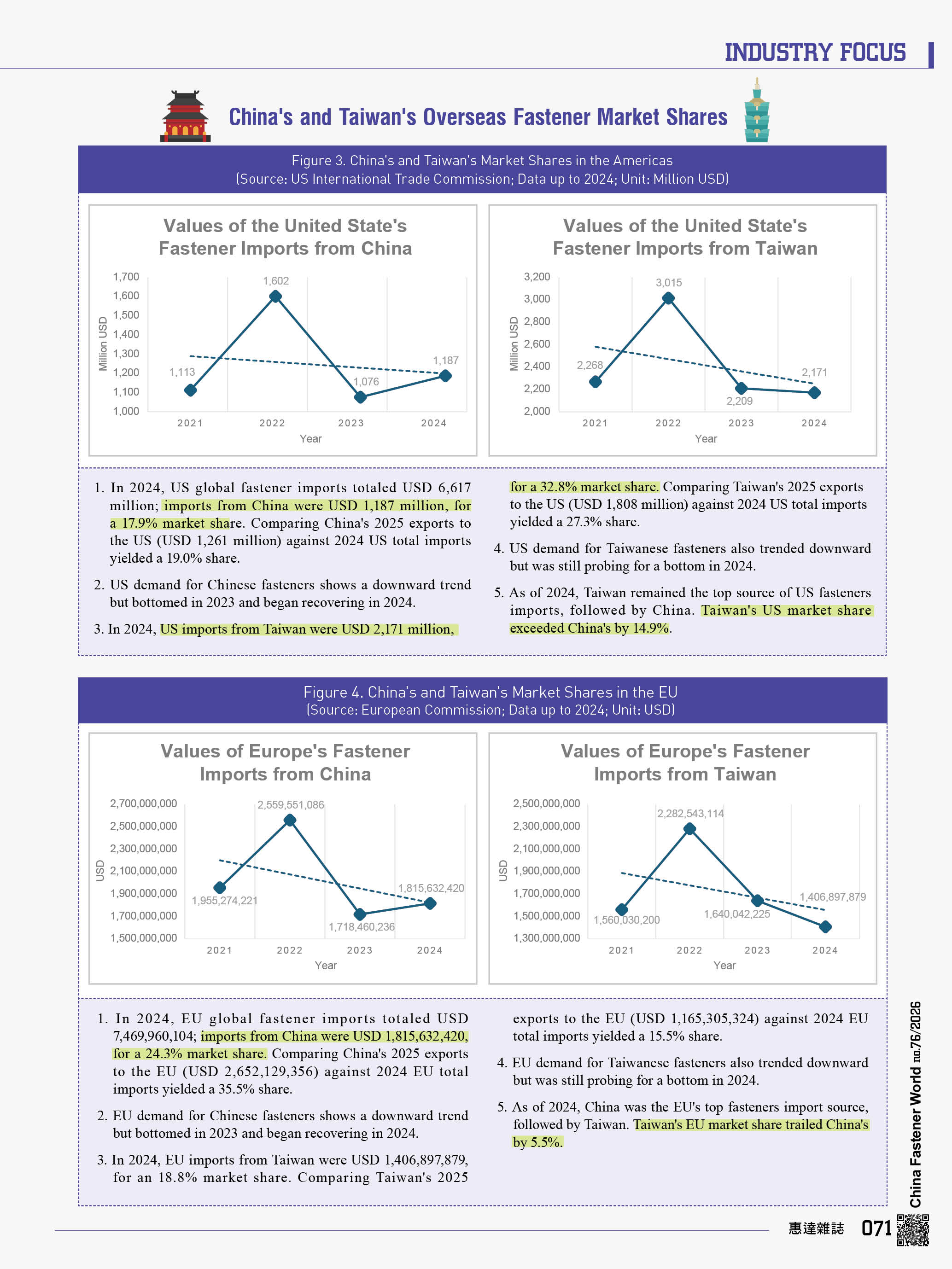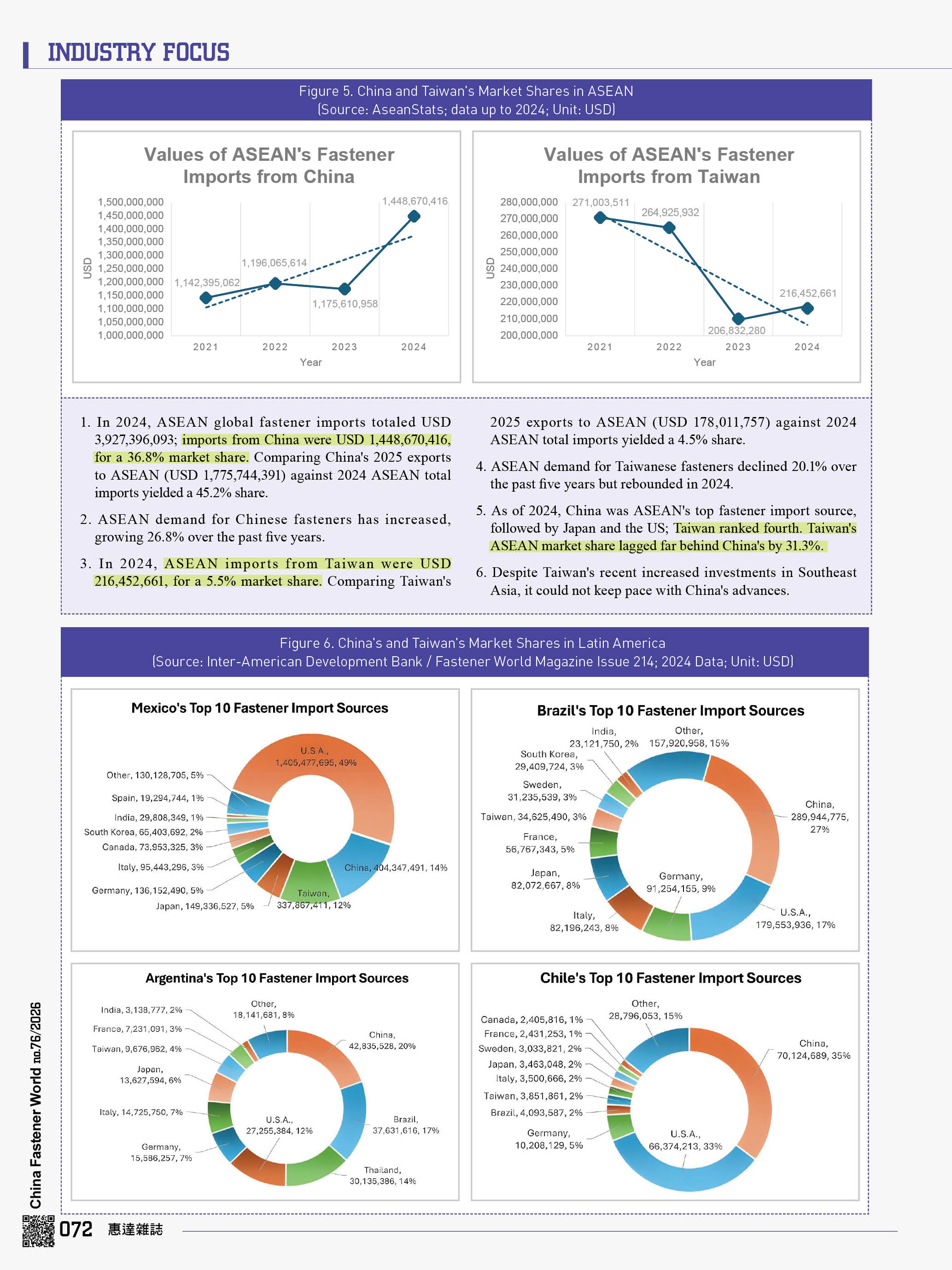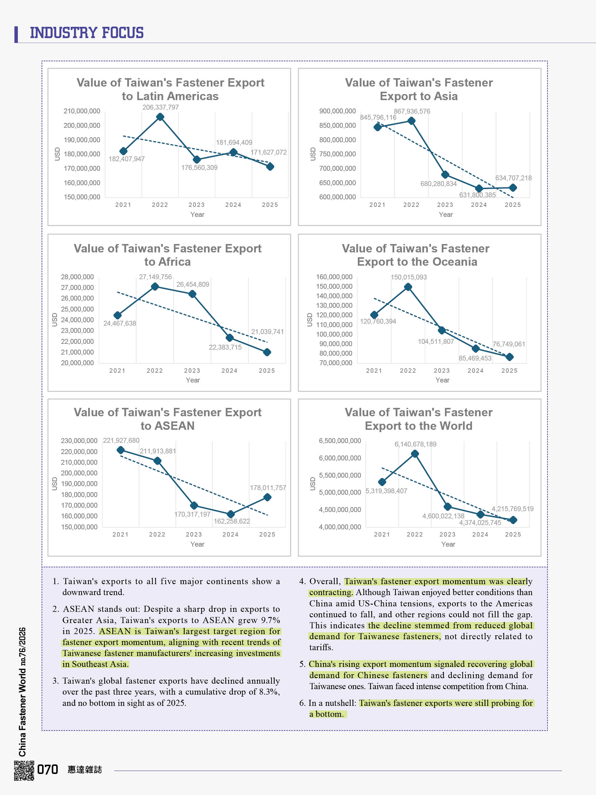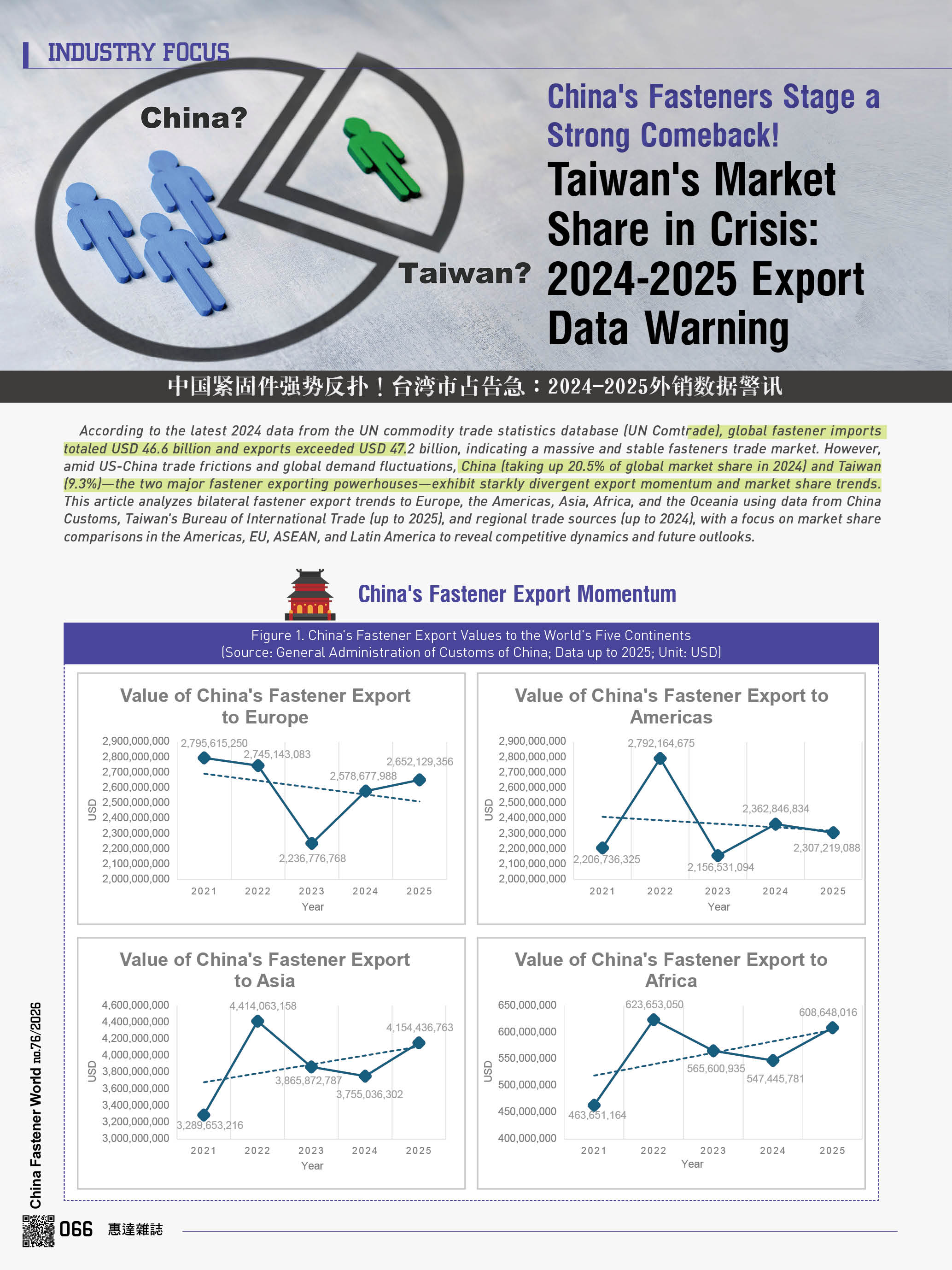 This article analyzes bilateral fastener export trends to Europe, the Americas, Asia, Africa, and the Oceania using data from China Customs, Taiwan's Bureau of International Trade (up to 2025), and regional trade sources (up to 2024), with a focus on market share comparisons in the Americas, EU, ASEAN, and Latin America to reveal competitive dynamics and future outlooks.