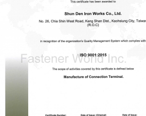 We are a professional manufacturer which is specialized in wire, forged & and die-casting parts, and fasteners, mainly for cargo ships, construction, machinery,and industrial purposes.It supplies screws, nuts, and other industrial parts in customized sizes and specifications in accordance with customers’drawings and samples. With over 30 years export experience, the company knows the importance of product quality, and applies its special cutting-edge heat treatment technology to produce high quality hex-key wrenches, torx hex key wrenches, impact bits,and nut setters.Its ultimate goal is to satisfy professional users with made-in-Taiwan (MIT) hand tools that can truly match and even surpass competing products from Japan,Europe and the U.S. in terms of quality,and build clients'confidence in MIT tools.