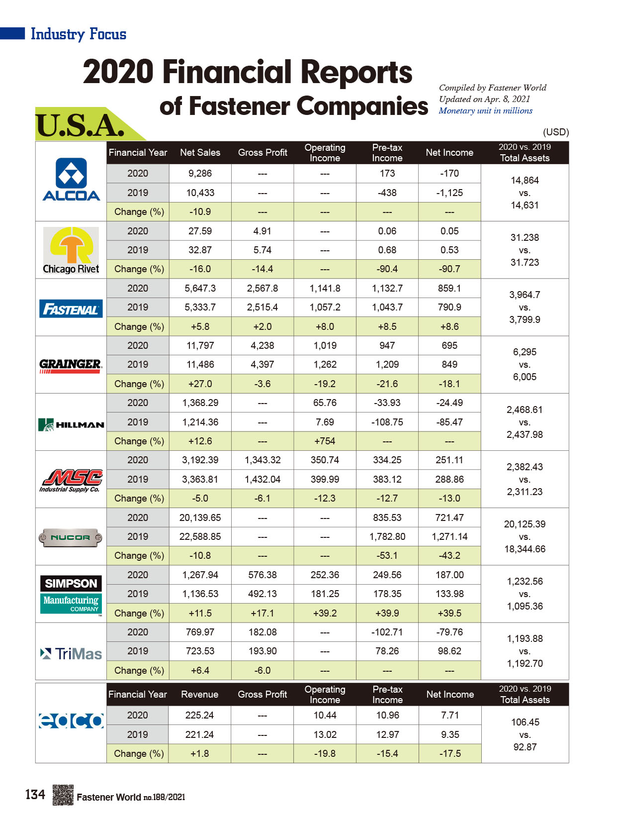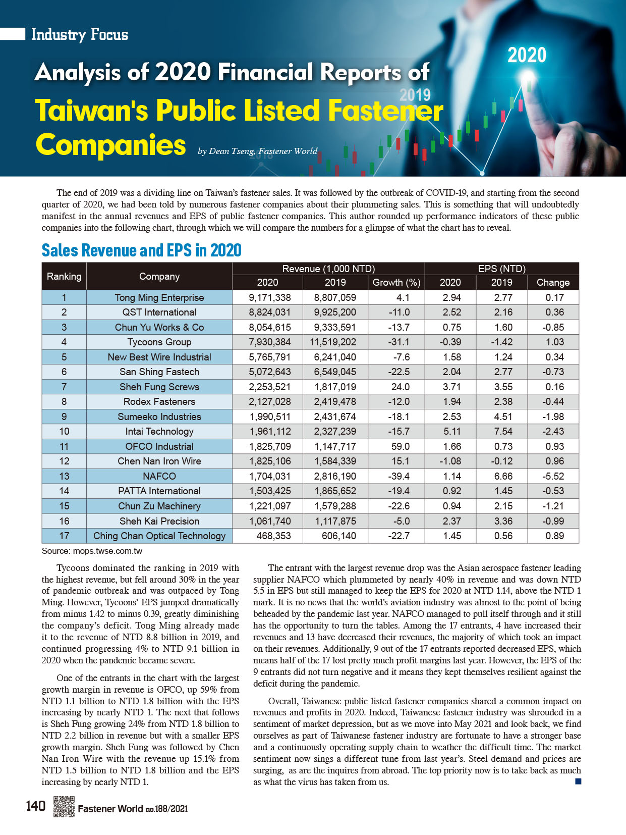 Analysis of 2020 Financial Reports of Taiwan's Rublic Listed Fastener Companies