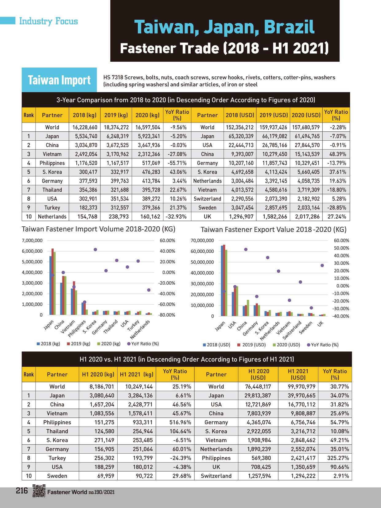 Taiwan, Japan, Brazil Fastener Trade (2018 - H1 2021)