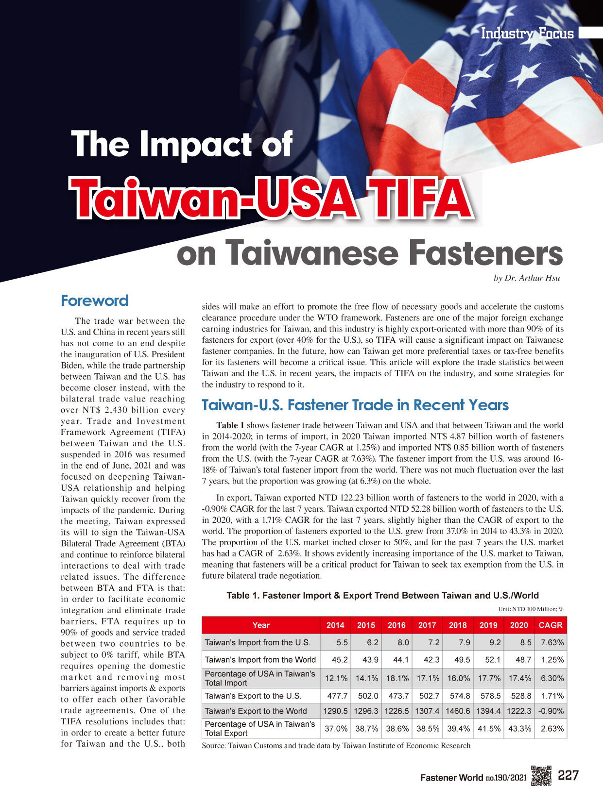 The Impact of Taiwan -USA TIFA on Taiwanese Fasteners ... Dr. Arthur Hsu