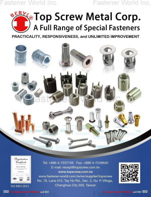 、小包裝螺絲…等系列緊扣件。從開發、設計、量產,在台灣經精密螺絲工業享有盛名,並行銷遍及日本、美國、澳洲、歐洲、東南亞、中東合客戶真正的需求。所有五金零組件均依照客戶所提供之樣品或設計圖面來做為報價或製造參考。主要產品:鑽尾螺絲、自攻螺絲、特殊...