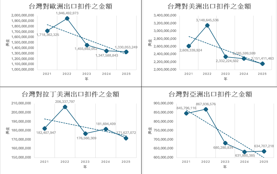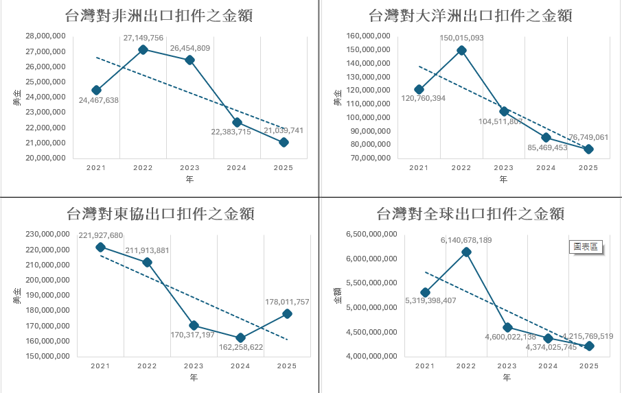 - 台灣對全球五大洲的出口額皆呈現下滑的大趨勢。