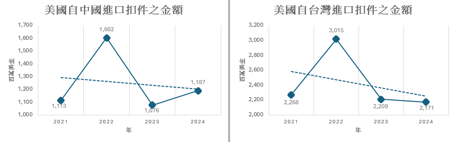 - 2024年,美國自全球進口扣件之總合為6,617百萬美金,同年美國自中國進口1,187萬美金,中國市占率為17.9%。若將中國在2025年對美國的出口額(1,261百萬美金),與2024年美國自全球進口扣件之總額相比,則市占率為19.0%。