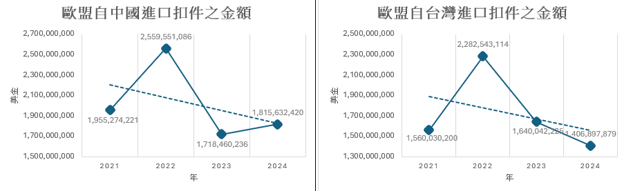 - 2024年,歐盟自台灣進口1,406,897,879美金,台灣市占率為18.8%。若將台灣在2025年對歐盟的出口額(1,165,305,324美金),與2024年歐盟自全球進口扣件之總額相比,則市占率為15.5%。