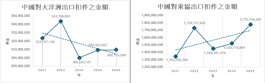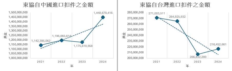 - 2024年,東協自全球進口扣件之總合為3,927,396,093美金,同年東協自中國進口1,448,670,416美金,中國市占率為36.8%。若將中國在2025年對東協的出口額(1,775,744,391美金),與2024年東協自全球進口扣件之總額相比,則市占率為45.2%。