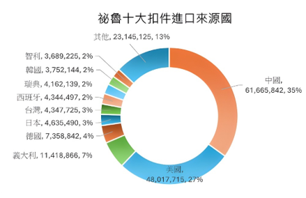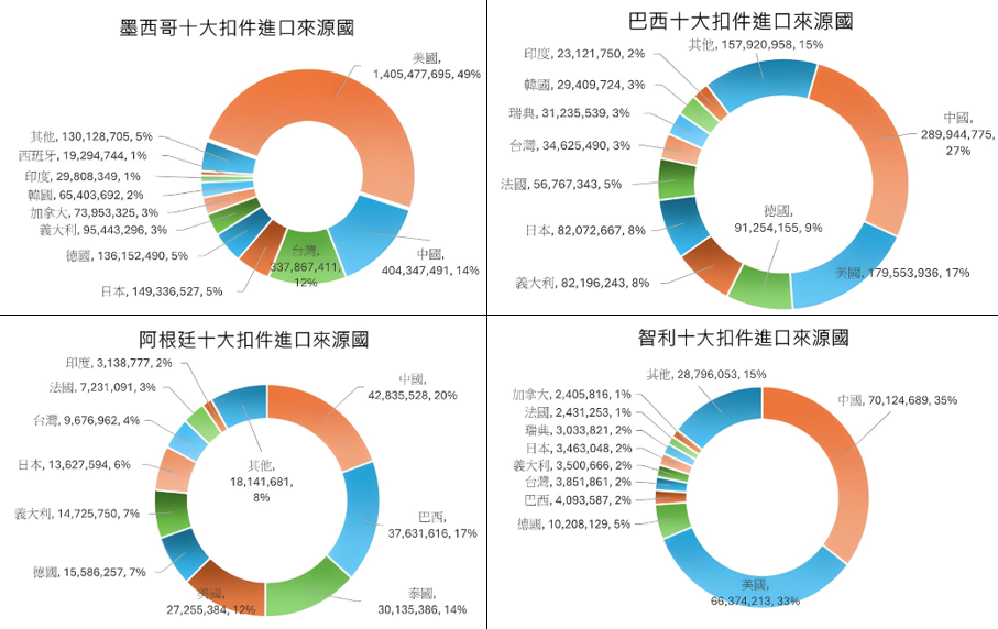 - 同年,前 5 大拉美國家自台灣進口390,369,449美金,台灣市占率約為8.0%。