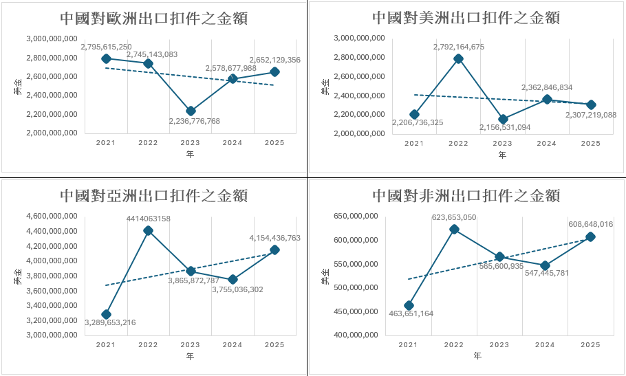 - 2025年,中國除了對東協出口的金額同年成長16.7%並突破過去五年來的新高之外,對其他區域的出口額皆未衝破同期的最高點。其中,其對歐洲、亞洲與非洲在2025年的出口額已正在趨近同期的最高點。