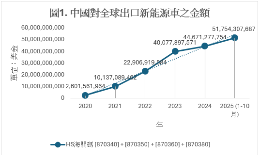 圖1(來源:中國海關總署)顯示中國新能源車對全球的出口額在過去五年呈現「跳躍式增長」,2021年成長超過3.8倍,2022年成長2.2倍,2023年成長1.7倍,在2025年前十個月成長1.1倍,達到517.54億美金。雖然增長的倍數因為來自歐洲、北美、其他市場的競爭而有下降,但在過去5年的周期內,總成長幅度已達到驚人的近20倍,從線狀圖來看,幾乎呈現「左下右上」完美貼近直線(趨勢線)的增長。由於2025年前十個月的出口額已大幅超越2024年,可斷定中國將在2025全年確立再度跳躍式增長。