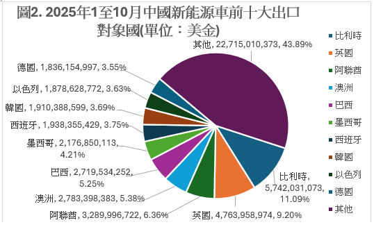 圖2(來源:中國海關總署)是中國新能源車的前十大出口對象國排行,顯示了一個值得注意的現象。截至2025年前十個月,扣除掉前十大出口對象國不算,中國對其他國家(包含186國)出口新能源車的佔比高達43%。除了對比利時以及對英國出口的佔比約為一成以外,其餘的前八大出口對象國的佔比各自皆約為五成。這顯示中國極度細分化地將新能源車透過出口擴散到世界各地。