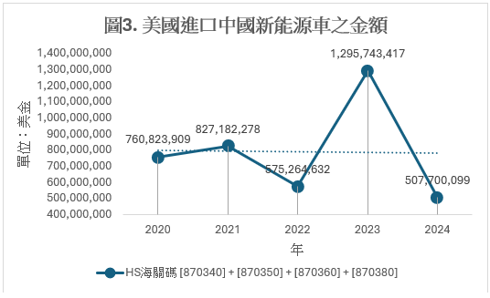 再從聯合國的數據來看,圖3(來源:Comtrade)顯示2020至2024年美國進口中國新能源車的金額變化。美國的進口額在2023年一度達到峰值(12.95億美金),隨即在2024年劇跌60.8%,落在5.07億美金,僅佔童年中國對全球出口額 (517.54億美金)的1.1%。換句話說,美國從中國進口的佔比在過去一年還在繼續下降,也免除了分析中國新能源車在美國市場佔比的必要性。