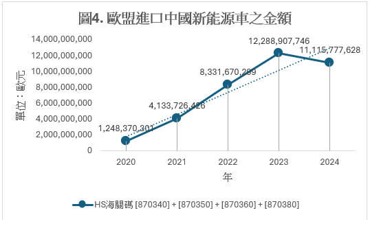 圖4(來源:Access2Markets)顯示歐盟進口中國新能源車的金額在2020與2023年之間暴增了9.8倍,並在2023年達到峰值(122.88億歐元),並在2024年下跌9.5%,落在111.15億歐元。雖然2025年的數據在本文截稿當下商未公告,但有報導指出歐盟提高關稅並加徵反補貼稅,可能將間接打擊新能源車對歐出口。