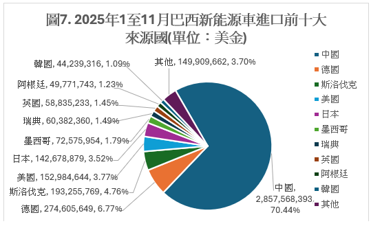 圖6(來源:Comtrade以及comexstat)顯示巴西進口中國新能源車的金額在2020年和2024年間暴增63.0倍,並在2025年前11個月下降5.9%,但與過去無年相比仍在非常高的水位上,再加上圖2顯示巴西是中國的第六大出口夥伴,顯見巴西對中國新能源車的需求仍很高。