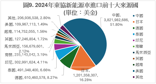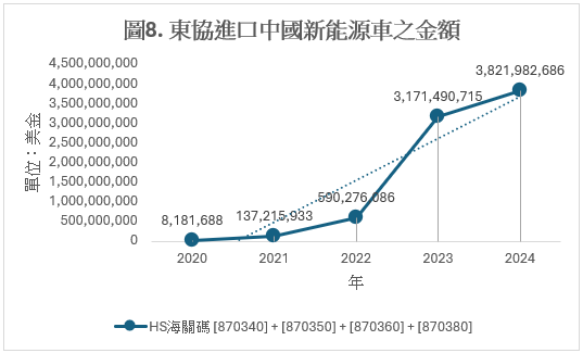 圖8(來源:ASEANstats)顯示東協進口中國新能源車的金額在2020與2024年之間連續五年都成長,在2024年達到38.21億美金,總成長幅度達到更驚人的467.1%,顯見東協對中國新能源車的猛爆需求。
